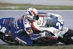 Initially he retired on the opening round in Malaysia and had only finished fourth in Indonesia whilst teammate Mick Doohan won the race. However, at the Japanese race, he took his first pole of the season on Saturday and finished second on Sunday.[13] In Spain however, he recorded his second retirement of the year. Initially taking the lead of the race from polesitter and teammate Doohan, as well as Luca Cadalora (who had a better start and thus led into turn one), Crivillé pulled a gap after a short battle with Cadalora, whose tyres began to fade. Crivillé then led for much of the race but Doohan was closing in at the final laps. On the last lap, spectators who already thought the race had ended, invaded the track around turn nine (the "Curva Àngel Nieto"), distracting Crivillé enough to allow Doohan to get back right on his tail going into the last couple of corners. Going into the last hairpin before the start-finish straight, Doohan went to the inside, going side-by-side with Crivillé. The pair did not touch, but Crivillé lost the rear whilst trying to accelerate, highsiding out of contention on the very last corner of the race, allowing Doohan to win the race as a result.[14][15][16]