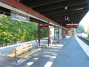 Ängbyplan metro station, formerly known as Färjestadsvägen metro station, is a station on the Green line of the Stockholm metro. It is located in the district of Södra Ängby, which is part of the borough of Bromma in the west of the city of Stockholm. The station is above ground and has a single island platform, with access from the underpass taking Färjestadsvägen under the line.[3][4] The distance to Slussen is 12.4 kilometres (7.7 mi).[1]