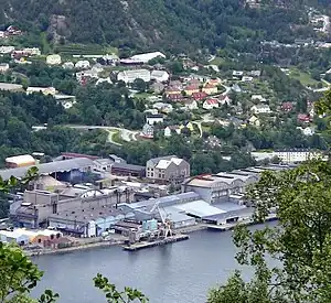 The former Bjølvefossen A/S is the village's main employer, it has historically dominated to such an extent that the village has been referred to as the most typical monotown in Norway.[3] It is now a subsidiary of Elkem, Elkem Bjølvefossen, which in turn is owned by China National Bluestar.[26] In 2006 it was decided to move ferrosilicon production to Elkem Iceland, and at that time the plant had a staff of about 160.[27] Elkem has since announced that the old production will be replaced by a process recycling waste from aluminium production, which will require a staff of about 60.[28] However, as of March 2012, production was still running at full capacity, and hiring new staff was being discussed.[29]