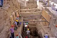 The site was first excavated by James Mellaart in 1958. He later led a team which further excavated there for four seasons between 1961 and 1965.[4][5][6][7] These excavations revealed this section of Anatolia as a centre of advanced culture in the Neolithic period.[8] Excavation revealed 18 successive layers of buildings signifying various stages of the settlement and eras of history. The bottom layer of buildings can be dated as early as 7100 BC while the top layer is from 5600 BC.[9]