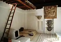 The population of the eastern mound has been estimated to be around 10,000 people, but the population likely varied over the community's history. An average population of between 5,000 and 7,000 is a reasonable estimate. The sites were set up as large numbers of buildings clustered together. Households looked to their neighbors for help, trade, and possible marriage for their children.[19] The inhabitants lived in mudbrick houses that were crammed together in an aggregate structure. No footpaths or streets were used between the dwellings, which were clustered in a honeycomb-like maze. Most were accessed by holes in the ceiling and doors on the side of the houses, with doors reached by ladders and stairs. The rooftops were effectively streets. The ceiling openings also served as the only source of ventilation, allowing smoke from the houses' open hearths and ovens to escape. Houses had plaster interiors accessed by squared-off timber ladders or steep stairs. These were usually on the south wall of the room, as were cooking hearths and ovens. The main rooms contained raised platforms that may have been used for a range of domestic activities. Typical houses contained two rooms for everyday activity, such as cooking and crafting.[19] All interior walls and platforms were plastered to a smooth finish.[8] Ancillary rooms were used as storage, and were accessed through low openings from main rooms.