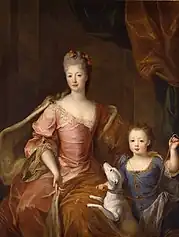 Portrait of Élisabeth Charlotte with her son Louis, hereditary prince of Lorraine, and a dog (by Pierre Gobert, 18th century).
