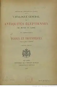 - Vernier, Émile; Service des Antiquités de l'Egypte (1927). Catalogue général des Antiquités égyptiennes du Musée du Caire. Vol. I: Bijoux et orfèvreries. Cairo: Institut français d'archéologie orientale.