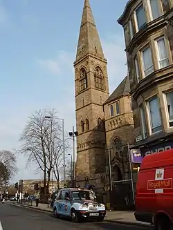 The building was founded as the Kelvinside Free Church, as a parish church of the Free Church of Scotland. The foundation stone was laid on 4 September 1862, and the church was built in the Neo-Gothic style, on designs by J. J. Stevenson. A spire was built in an Italian Gothic Pyramid style.[2] After the Free Church of Scotland joined the United Presbyterian Church in 1900 to form the United Free Church of Scotland, the church was renamed the Kelvinside United Free Church. [3]