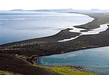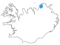 Öxarfjörður is encircled by mountain ranges to the west and east, and the Gjástykki [ˈcauːˌstɪhcɪ] lava fields and an area with sand deposited by the glacial river Jökulsá á Fjöllum in the south. The only village in the area is Kópasker with about 130 inhabitants.[1] The Mid-Atlantic ridge runs through the western part of the fjord before going underwater again. Öxarfjörður went deeper inland in earlier geological times but the glacial river Jökulsá deposited sands from the highlands on a triangular area of about 300 km² called Sandur [ˈsantʏr̥]. Sandur is still trenched by the delta of Jökulsá which is constantly changing its riverbed. There are two big lakes on Sandur, Vikingavatn and Skjálftavatn [ˈscaul̥taˌvahtn̥], the latter one formed by an earthquake in 1976, over the course of which some houses in the area were destroyed.
