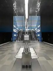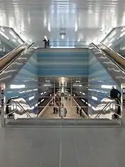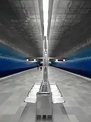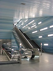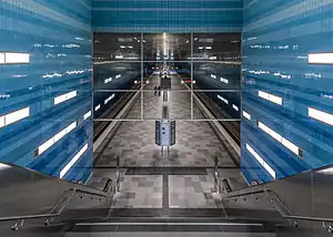 The stop was designed by the Netzwerkarchitekten architecture studio from Darmstadt. The walls are clad in blue ceramic-coated glass tiles that get darker the further down they go, recalling the undersea world. Silver-colored plates on the ceiling give the impression of a water surface.[3] This underwater theme ties in nicely with the fact that the neighborhood is next to the harbor, and with the name of the stop, which translates as "Overseas Quarter", where the overseas part would provide the seafaring theme, and a playful interpretation of "over-seas" could see the neighborhood as over the sea and the metro station as below it and hence underwater...