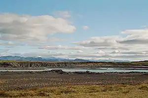 Þjórsá is a glacier river and has its source on the glacier Hofsjökull. It flows out through narrow gorges in the highlands of Iceland. Further downstream, another river, the Tungnaá, flows into it (see also Háifoss), before it enters the lowlands. There it passes the valley of Þjórsárdalur (Thjorsardalur) where the historical farm of Stöng is located.[2] In the lowlands it flows along the eastern border of the Great Þjórsá Lava.