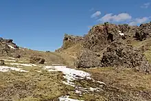 It also built up a meltwater lake that Pedersen et al. define as “a pillow-dominated flat-topped tuya without a lava cap”.[5] H. Björnsson explains that though the mountain is crossed by many faults and a graben, so that it looks like a complex formation, its origin is in a single eruption.[4]
