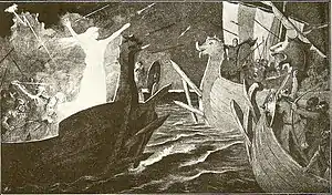 Hávard the Hewing, in the fleet of Haakon, first spots Þorgerðr there and then many others see her. The wind wanes and the men witness arrows flying from the fingertips of Þorgerðr, each arrow killing a man of the Jomsviking fleet. The Jomsvikings tell Sigvaldi that although they are no longer fighting men alone, they will still do their best.[9] The storm lessens again and once again Haakon invokes Þorgerðr. The saga describes this attack: