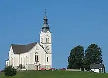 The parish church in the settlement is dedicated to Saint Leonard.[7] It stands west of the settlement on Church Hill (Cerkovni grič). A church at the site was first mentioned in 1526, reworked in 1758. The current structure was built in 1899 based on plans by Moritz (or Moric) Kirchschlager[8] after the earthquake of 1895, which destroyed the previous structure. The interior was painted by Simon Ogrin.[8] The main altar was made in the Ljubljana workshop of the Toman (Thomann) family of stonemasons, and the side altar and pulpit are the work of Valentin Šubic (1859–1927). A chapel dedicated to the Virgin Mary was built next to the rectory in 1850.[4] The church is registered as a cultural monument.[8]