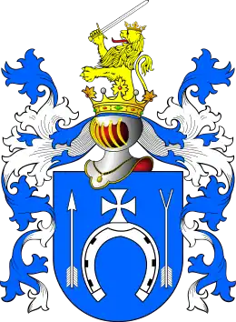 According to Długosz: red, a horseshoe argent, silver horseshoe pointing downwards, surmounted of a golden cross pattée; on the right, a silver arrow in a pale, on the left, an arrow with a pall pointing downwards; in the crest, a golden half-leaf in a crown with a sword in its right paw.[3]