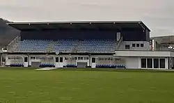 At the beginning of the 2014–15 season the construction of the new stands for the Sports Park was completed with a seating capacity of 301.[28] The club used the stands for home matches for the first time during the season. On 20 July 2015 Radgona hosted Slovenian champions NK Maribor in a pre-season friendly which was the official opening of the newly build stands.[29] Jean-Philippe Mendy opened the scoring in the first minute in front of 1,000 spectators and after a brace from Marcos Tavares, the visitors had a five-goal lead by half time. In the second half Radgona scored two own goals and substitute striker Dalibor Volaš scored four goals for the final score of 0–12.[29]