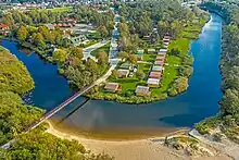 Šventoji (Samogitian: Švėntuojė; Latvian: Sventāja) is a small resort town on the coast of the Baltic Sea in Lithuania. Administratively it is part of Palanga City Municipality. The total population of Šventoji as of 2012 was 2631. The town is located about 12 km north of Palanga center and close to the border with Latvia. Further north of the town is Būtingė and its oil terminal. Šventoji River flows into the Baltic sea at the town. The town also has a famous lighthouse, which is located 780 meters from the sea. Its height is 39 meters. The town is a popular summer resort for families, during summer it has many cafes, restaurants and various attractions for the visitors.