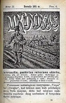 Ūkininkas or Ukinįkas (literally: The Farmer) was a monthly Lithuanian-language newspaper published during the Lithuanian press ban by the editorial staff of Varpas from 1890 to 1905. Ūkininkas was printed in Tilsit (current Sovetsk) and Ragnit (current Neman) in German East Prussia and smuggled into Lithuania by the knygnešiai.