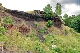Then came another kind of volcanic (magmatic) activity, with less developed layering, which deposited black to dark-brown (melanephelinitic), slightly welded material, which contains fragments and blocks of porous lava, larger chunks of solidified lava known as volcanic bombs, and smaller fragments known as lapilli.[5]