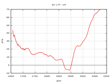 seconds for ΔT.[14][15] Smoothed historical measurements of ΔT using total solar eclipses are about +17190 s in the year −500 (501 BC), +10580 s in 0 (1 BC), +5710 s in 500, +1570 s in 1000, and +200 s in 1500. After the invention of the telescope, measurements were made by observing occultations of stars by the Moon, which allowed the derivation of more closely spaced and more accurate values for ΔT. ΔT continued to decrease until it reached a plateau of +11 ± 6 s between 1680 and 1866. For about three decades immediately before 1902 it was negative, reaching −6.64 s. Then it increased to +63.83 s in January 2000 and +68.97 s in January 2018[16] and +69.361 s in January 2020, after even a slight decrease from 69.358 s in July 2019 to 69.338 s in September and October 2019 and a new increase in November and December 2019. This will require the addition of an ever-greater number of leap seconds to UTC as long as UTC tracks UT1 with one-second adjustments. (The SI second as now used for UTC, when adopted, was already a little shorter than the current value of the second of mean solar time.[17][18]) Physically, the meridian of Greenwich in Universal Time is almost always to the east of the meridian in Terrestrial Time, both in the past and in the future. +17190 s or about 4+34 h corresponds to 71.625°E. This means that in the year −500 (501 BC), Earth's faster rotation would cause a total solar eclipse to occur 71.625° to the east of the location calculated using the uniform TT.