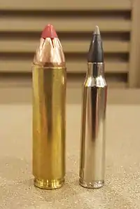 The .450 Bushmaster makes use of .452 in. bullets because the lower impact velocities and energies would not adequately expand the heavier jacketed .458 in. bullets.[6] The cartridge is chambered in bolt-action rifles by Ruger, Savage, Mossberg, and Remington, Ruger's No. 1 single shot rifle, AR-15 rifles, as well as an AR-15 pistol by Franklin Armory.[7]