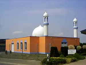 | 8. | Aziz Mosque | Riedstadt | Hesse | 2004 | "Mosque of the all-powerful“, foundation Nov 2003, completed Aug 2004, plot 1753 m2, prayer hall 200 m2, one minaret 14 m height[8] 49°49′54.9″N 8°29′6.4″E / 49.831917°N 8.485111°E[M 10] | ![]() |