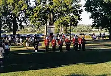 The 104th is unique in Canadian history as the only regular British Army regiment to be raised and serve in the region during the Napoleonic period.[23] It is honoured by a Historic Sites and Monument Board of Canada plaque on the wall of the Soldiers' Barracks on Queen Street, Fredericton, and a monument in the nearby Officers' Square.[19] The modern Canadian Army unit The Royal New Brunswick Regiment perpetuates the lineage of the 104th, though is not descended from the 104th.[28] The colours of the regiment are maintained and were restored to commemorate the 200th anniversary of their 1813 march to Kingston.[25] The march itself was recreated by a group of re-enactors to mark the bicentenary.[20]