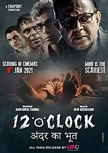 12 'O' Clock is a 2021 Indian Hindi-language horror film directed by Ram Gopal Varma and starring Mithun Chakraborty, Flora Saini, Manav Kaul, Krishna Gautam and Makarand Deshpande.[2][3][4] The film was first announced with the name Geher, but the following trailer revealed it had been renamed 12 'O' Clock on 3 July 2020.[5][6][7] It was released in India on 8 January 2021.[1]