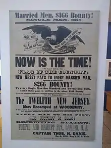 The 12th New Jersey Infantry Regiment was organized at Camp Stockton in Woodbury, New Jersey, in the summer of 1862 in response to President Abraham Lincoln's call for an additional 300,000 men for the Union Army. After training through the summer, it was officially mustered into the Union Army on September 4, 1862.[1][2]