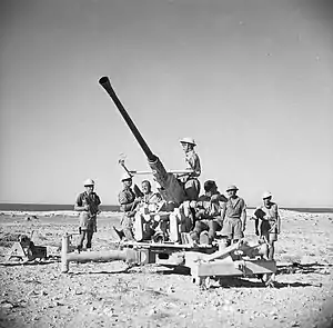 14th Light Anti-Aircraft Regiment was formed at Papakura Camp on 7 January 1940. No anti-aircraft guns were available in New Zealand at that time and the regiment was forced to train without any anit-aircraft equipment. In May 1941 the regiment arrived in Egypt and joined the New Zealand Division which had just been evacuated from Crete. Only in June did the regiment receive its first 40 mm Bofors anti-aircraft guns. The regiment was organised into a headquarters battery and three gun batteries: 41, 42 and 43 batteries. Each battery had 12 Bofors guns, for a total of 36 guns, and was further subdivided into three troops.[Note 1][1]
