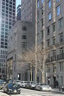 South of the entrance pavilion, accessed from a driveway on 61st Street, is a "motor court" paved in cobblestones.[15][21] The motor court measures 70 by 200 ft (21 by 61 m)[16] and is arranged around a black-granite fountain.[21] The building's management discouraged chauffeurs from waiting in the motor court; many chauffeurs instead wait on a shoulder along Central Park West, which is designated as a no-parking zone. After the building opened, there were controversies over the fact that chauffeurs were using the shoulder illegally.[22] There is also a private outdoor garden for tenants along 62nd Street, north of the entrance pavilion.[21][23] The private garden contains a reflecting pool, which serves as a skylight above the swimming pool in the basement.[21][24] The garden can also be arranged to accommodate additional seating for the building's dining room.[25]