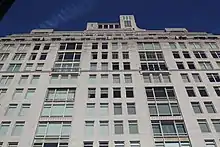 There are large windows, many of which contain small balconies.[16][28] The windows were intended to appeal to buyers while also retaining the character of the limestone facades.[20] Some of the windows are narrower than the others, indicating the internal arrangement of each apartment.[26] The southern elevation of the Tower is visible from Columbus Circle two blocks away. The center of the Tower's southern elevation contains a vertical strip of bay windows, emphasizing the building's vertical dimension.[32] On the Tower's western elevation, there is a deep indentation at the center of the facade, just above the retail podium on Broadway.[33]