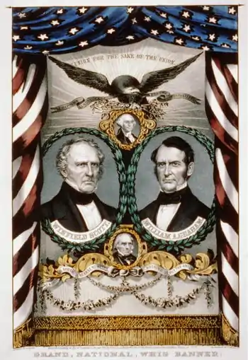 The party had been divided by the Compromise of 1850 and was divided over the presidential nomination between incumbent President Millard Fillmore, who received support from the South, and Winfield Scott, who received his support from the North. William H. Seward, who had been the main opponent of the compromise in the United States Senate and advised President Zachary Taylor against it, supported Scott. Fillmore offered to give his delegates to Daniel Webster if he received the support of forty-one delegates on his own, but Webster was unsuccessful. Scott won the nomination on the 53rd ballot. William Alexander Graham won the vice-presidential nomination without a formal vote.[2][4]