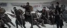 1864 was produced by Miso Film for DR. It was a co-production with Film Fyn, TV2 (Norway), TV4 (Sweden), SF Studios, ARTE, ZDF Enterprises and Sirena Film (Czech Republic).[1] DR had recently produced the highly successful series The Killing, Borgen and The Bridge,[2] and several of the stars of those series, such as Lars Mikkelsen, Sidse Babett Knudsen and Søren Malling, were among the cast.[3] 1864 was filmed on location at Dybbøl, scene of the climactic battle of the war, in the Svanninge Hills on Funen, and at Hagenskov, Egebjerggård and Hvidkilde Manors, also on Funen.[2] The battle scenes were filmed in the Czech Republic over a period of seven weeks.[4] Tom Buk-Swienty, on whose books the series was based, was a historical consultant on the series.[5] It was the most expensive television series ever made in Denmark, with a projected cost of 173 million kroner (about $25 million).[5]