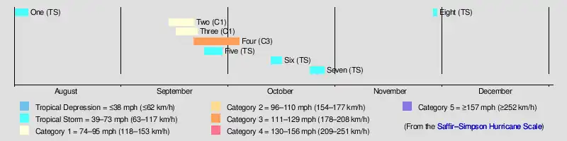 A tropical storm formed in the Gulf of Mexico on September 14. On September 16 it reached peak intensity as an 80 mph (129 km/h) hurricane while it was within 120 miles (193 km) of the Texas coast. Although heavy rain and high tides were seen all along the Texas coast,[3] the hurricane veered eastward, so avoiding a landfall in Texas. However, on September 18 it made landfall in Louisiana while at the same strength. On September 19 the hurricane made another landfall at Fort Walton Beach, Florida. It quickly weakened back to a tropical storm while still in the state of Florida. It emerged into the Atlantic on September 20. The storm dissipated about 200 miles south of North Carolina on September 21.[2]