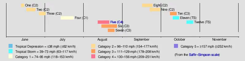 Although other storms may have gone undetected, tropical activity definitely began by the middle of June with the formation of the first named storm over the western Gulf of Mexico on June 13. Two other storms formed before the end of the month and also reached the Gulf of Mexico. The first three storms of the season each attained hurricane intensity and eventually made landfall on the U.S. Gulf Coast with winds of 100 mph (160 km/h).[4] A mid-July storm that formed over the western Caribbean moved northward and struck the west coast of Florida as a hurricane, after two earlier, stronger storms had already done so. Never before or since have so many hurricanes struck Florida in the same season before the month of August.[11] Three storms, all of which attained major hurricane intensity, formed in close succession, over a span of eight days, in August. The first of these, the Indianola hurricane, was the strongest and most intense tropical cyclone of the season, striking multiple islands in the Greater Antilles before rapidly strengthening over the western Gulf of Mexico. It struck the U.S. state of Texas on August 20 with winds of 150 mph (240 km/h), making it one of the strongest hurricanes on record to hit the state.[10] September was a less active month than August, featuring two hurricanes on and just after mid-month. The final hurricane of the year formed in early October and struck Louisiana with winds of 120 mph (190 km/h). Two additional tropical storms occurred in October, with no further activity confirmed afterward.[4]