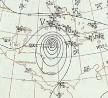 Historical weather maps note that a tropical storm was first observed about 415 mi (670 km) northeast of Anguilla early on September 26.[5][2] Initially, the storm moved west-northwestward, but curved northwestward late the following day. At 00:00 UTC on September 28, the cyclone intensified into a Category 1 hurricane and then a Category 2 hurricane 12 hours later while curving to the northeast.[2] While passing near Bermuda late on September 28, the storm attained its peak intensity with maximum sustained winds of 110 mph (175 km/h) and a minimum barometric pressure of 988 mbar (29.2 inHg), which was observed in Hamilton.[1] The system then began to accelerate and weaken, falling to Category 1 intensity at 00:00 UTC on September 30. Six hours later, the hurricane transitioned into an extratropical cyclone while located about 495 mi (795 km) southeast of Cape Race, Newfoundland. The remnants moved continued rapidly northeastward and dissipated later that day.[2]
