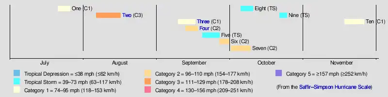 The season had a total of 10 tropical storms, 7 of which intensified into a hurricane. This marked the most hurricanes in a season since the total of eight in 1893.[3] There may have been an additional four tropical depressions throughout the season, but the data obtained by the Atlantic hurricane reanalysis project was inconclusive. The reanalysis added a previously undetected tropical storm in late October to the Atlantic hurricane database (HURDAT). Reanalysis also resulted in the eighth cyclone being downgraded from a Category 2 hurricane to a tropical storm.[1] Nearly all of the season's 10 tropical cyclones impacted land. Collectively, the storms caused over $18.5 million in damage and at least 222 fatalities.[4]
