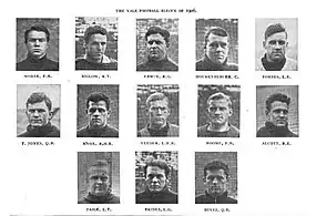 Four Yale players were among the eleven selected as consensus first-team players on the 1906 All-America team.[4] Yale's four consensus All Americans were: halfback William F. Knox; fullback Paul Veeder; end Robert Forbes; and tackle Lucius Horatio Biglow. Five other Yale players receiving All-American honors were quarterback Tad Jones, fullback Samuel F. B. Morse, center Clarence Hockenberger, end Clarence Alcott, and Arthur Brides.[5][6][7][8]