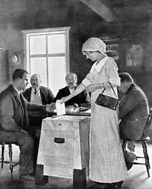 Finnish woman voting at 1907 Parliamentary Election. Woman is standing as she puts her vote into ballot box as men sit and watch.