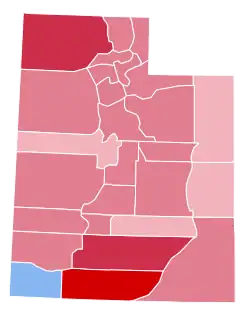 Although Democrat/Populist Bryan had carried Utah in its debut presidential election by a five-to-one margin, the Republican Party – ditching ancestral hostility to the state's dominant Mormon religion[1] – was soon able to take control of the state, despite a threat from the anti-Mormon "American Party" in urban areas with sizeable non-Mormon ("Gentile") populations.[2] In its third election of 1904, the Beehive State had given a virtual two-to-one majority for Theodore Roosevelt against New York Democrat Alton B. Parker, who carried only Dixie's Washington County.