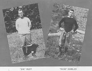 Accordingly, the December 12 edition of The Pitt Weekly reported: "Because of his brilliant work in turning out a winning team this past season Joe Duff, former Princeton player, was re-elected coach of the University football eleven for next year at a meeting of the General Athletic Committee."[14] Edwin H. W. "Nubs" Harlan was retained as assistant coach by Coach Duff.[15]