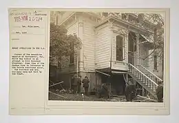At 11:55 p.m. on December 17, 1917, the Governor and his wife Flora awoke to what they described as a "nervous shock". While no one was injured, including all of the servants, windows were shattered as far as two to three blocks away.[4] When the police arrived, they found Governor Stephens, with little care, wading through the wet, muddy basement in search of a clue as to how the bomb had been placed.[5] While neither he nor his guard had seen the perpetrator nor the act first hand, they both expressed the belief that the bomb had been thrown from an alley running about 40 feet from the rear of the house. As for the motive, Stephens was convinced of it "probably having been done with a view to terrorism, the chief weapon of the alien enemy," a claim likely linked to his recent series of addresses urging support for the war.[4]