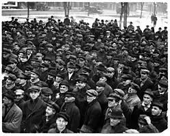 On the morning of Wednesday, December 5, about 15,000 unionists met at the Saint Paul Auditorium and heard speeches from notable labor activists, including Mayor Van Lear.[37] The unionists pledged their support to the streetcar union members and demanded the firing of both McGee and Charles W. Ames from the MCPS.[37] Additionally, they voted to wait until December 11 for federal intervention, vowing to gather again and vote on a general strike if intervention had not occurred by that time.[37] In a bid to show he was not antilabor, Governor Burnquist fired Ames, though kept McGee on the commission.[37] Several days later, on December 7, APL members learned through espionage that some machinist union members were planning a possible statewide general strike.[41] A general strike in the Twin Cities was officially declared to begin at 10:00 a.m. on December 13.[42][43] The union stated that they expected 30,000 people to go on strike, prompting fears that martial law would be declared.[42][44] Governor Burnquist ordered that all liquor stores be closed and instructed the sheriffs of both Hennepin and Ramsey counties to maintain order.[42] By noon, over 10,000 people had walked out of their jobs.[42][43] By that time, Secretary Baker, acting under the authority of United States President Woodrow Wilson, telegraphed William Bauchop Wilson of the President's Mediation Commission to investigate the developments in the Twin Cities, citing a "federal interest" in the matter.[42] Having achieved their goal of federal intervention, at 1:30 p.m., E. G. Hall, the president of the Minnesota chapter of the AFL, called off the strike.[42] In total, this general strike had lasted less than four hours,[32] with no reports of violence.[42] Governor Burnquist, while agreeing to meet with federal mediators, voiced stern opposition to the federal government's decision, calling it an overreach of their power.[42]