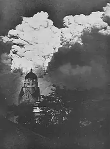 At 11.55 a.m. ship commenced to tremble and vibrate violently and on looking towards the shore it was seen that a terrible earthquake was taking place, buildings were collapsing in all directions and in a few minutes nothing could be seen for clouds of dust. When these cleared away fire could be seen starting in many directions and in half an hour the whole city was in flames.[21]