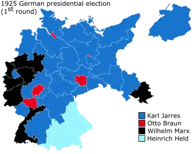 A number of candidates stood in the first round. Hindenburg was not included among them as he would not be nominated as a candidate until the second round. Instead, the most popular candidate of the political right was Karl Jarres of the German People's Party (DVP), a former Minister of the Interior, Vice-Chancellor of Germany and mayor of Duisburg. Otto Braun, the SPD's candidate, was a former Minister-President of Prussia and a well known and respected figure. The Centre Party's candidate, Wilhelm Marx, was the chair of the party and a former chancellor.