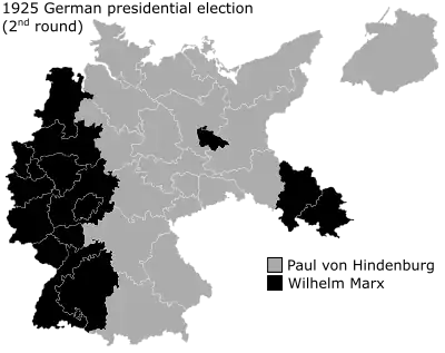 Presidential elections were held in Germany on 29 March 1925, with a runoff on 26 April.[1] They were the first direct elections to the office of President of the Reich (Reichspräsident), Germany's head of state during the 1919–33 Weimar Republic.[2] The first President, Friedrich Ebert, who had died on 28 February 1925, had been elected indirectly, by the National Assembly, but the Weimar Constitution required that his successor be elected by the "whole German people". Paul von Hindenburg was elected as the second president of Germany in the second round of voting.