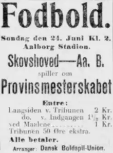 - 1 2 3 "Fodbold. Søndag den 24. Juni Kl. 2. Aalborg Stadion. Skovshoved—Aa. B. spiller om Provinsmesterskabet" (in Danish). No. 162. Aargang, Nr. 168. Aalborg Stiftstidende. 22 June 1928. p. 10.