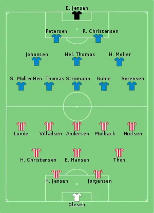 As a consequence of the strong winds IK Viking Rønne was able to compete on equal terms against the much stronger Skovshoved IF-players, which was emphasized during the second half.[10][22][21] After a few minutes, SIF scored the first goal, greatly assisted by IK Viking's Niels Mortensen, whereafter they progressed in gaining the upper hand for the remaining part of the match, and were quite dominant in the last 15 minutes — a local newspaper, based on Bornholm, referred this to insufficient training on the Rønne-players' part.[10][22][20] The Rønne-team's Charles Olsen and Karl Mortensen had some great opportunities for scoring goals, but both failed to accomplish the objective.[20] During the second half, the home team's centerforward, Svend Strømann, scored four goals — between 2 and 3 goals using his head — while the team's right winger Ernst Sørensen and the team captain, Helmuth Thomas, each scored one goal — contributing to Skovshoved IF's victory of 6–1.[10] According to the local Bornholm newspaper, players on both teams hailed the IK Viking goalkeeper, Vilhelm Reker, as the best player on the field.[10]