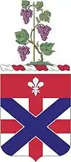 The shield is white, the old facings of the Infantry. The red cross is for Revolutionary War service and the blue saltire for Civil War service. The fleur-de-lis on the red chief, the present color for Artillery, represents service as Artillery in France during World War I.