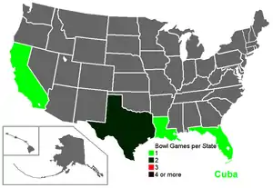 Number of bowl games per state. Note that the Bacardi Bowl was held in Havana, Cuba.