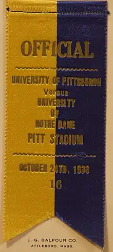 The 1936 Pittsburgh Panthers football team represented the University of Pittsburgh in the 1936 college football season. In its 13th season under head coach Jock Sutherland, the team compiled a 8–1–1 record, shut out five of its ten opponents, and outscored all opponents by a total of 214 to 34.[1] The team played its home games at Pitt Stadium in Pittsburgh. The Panthers won the Rose Bowl and were selected national champion by the contemporary Boand math system and retroactively years later by the Football Researchers poll and Houlgate math system.[2][3][4][5]