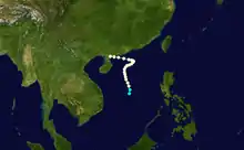 On July 22, a low pressure area formed into a tropical depression while located about halfway between the Philippines and the Marianas Islands. The depression steadily intensified as it tracked to the northwest, and attained typhoon status on July 18. After a brief turn to the north-northeast, the storm changed its motion to the northwest, and made landfall on southeastern Taiwan and later on China on July 20 about 120 miles (190 km) south of Shanghai. It quickly dissipated. A station in the Ryūkyū Islands reported a pressure of 997.0 hectopascals (29.44 inHg) with light winds.[5]
