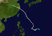 A tropical depression developed roughly 250 miles (400 km) of the eastern Philippines on July 7. The depression tracked northwestward initially, and after intensifying into a typhoon its motion turned to the north-northeast, followed by a turn back to the northwest on July 10. The typhoon crossed the East China Sea and made landfall on eastern China near Shanghai on July 12, where 80-mph (130-km/h) winds and a pressure of 992.0 hectopascals (29.29 inHg) were recorded. The storm weakened as it continued its motion while roughly paralleling the northern coastline, and dissipated on July 13. The passage of the typhoon killed at least six people in Shanghai.[5]